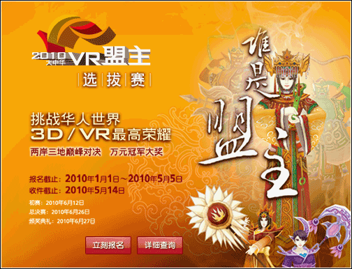 从“2010’VR盟主选拔赛”组委会传来的消息,VR盟主参赛报名截止工作将于5月5日结束。