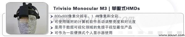 Trivisio Monocular M3是一款单眼微型显示器,佩戴于使用者眼部,是用于数据可视化领域的免提平视型产品。该产品注重于移动应用功能,可作为一款便携式个人显示器使用,也可用于多媒体和远程医学等领域。