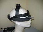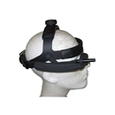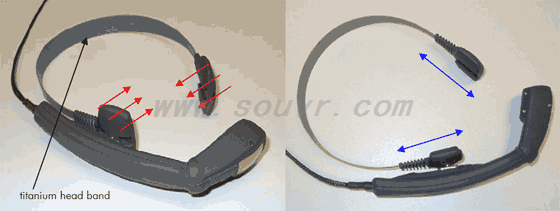 钛金属头带对使用者头部的压力(称为“弹簧力”,此处用红色箭头标示)已由制造商提前设置,且仅能由其进行调整。因此,有必要提前声明佩戴Monocular M3产品的使用者头部尺寸范围。右上角图表中的蓝色箭头表示了头带尺寸的手调范围。
