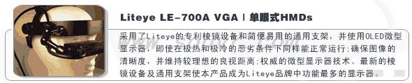 Liteye LE-700非透视型头戴式显示器结合采用了Liteye的专利棱镜设备和简便易用的通用支架,并使用OLED微型显示器,降低了耗电量且操作更加便捷,即使在极热和极冷的恶劣条件下同样能正常运行。
