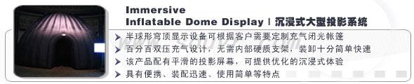 除折叠式布制穹顶和硬壳式穹顶以外,Immersive Display Solutions公司还提供多种双压充气式穹顶显示系统。该产品可根据客户需求随意伸缩,具有便携、装配迅速、使用简单等特点。产品配有平滑的投影屏幕,可提供优化的沉浸式体验;产品可多角度安装(水平、垂直或倾斜),采用100%充气设计,无需内部硬质支架,装卸十分简单快速。3米规格的充气式穹顶显示系统可在30分钟内完成充气并投入使用。